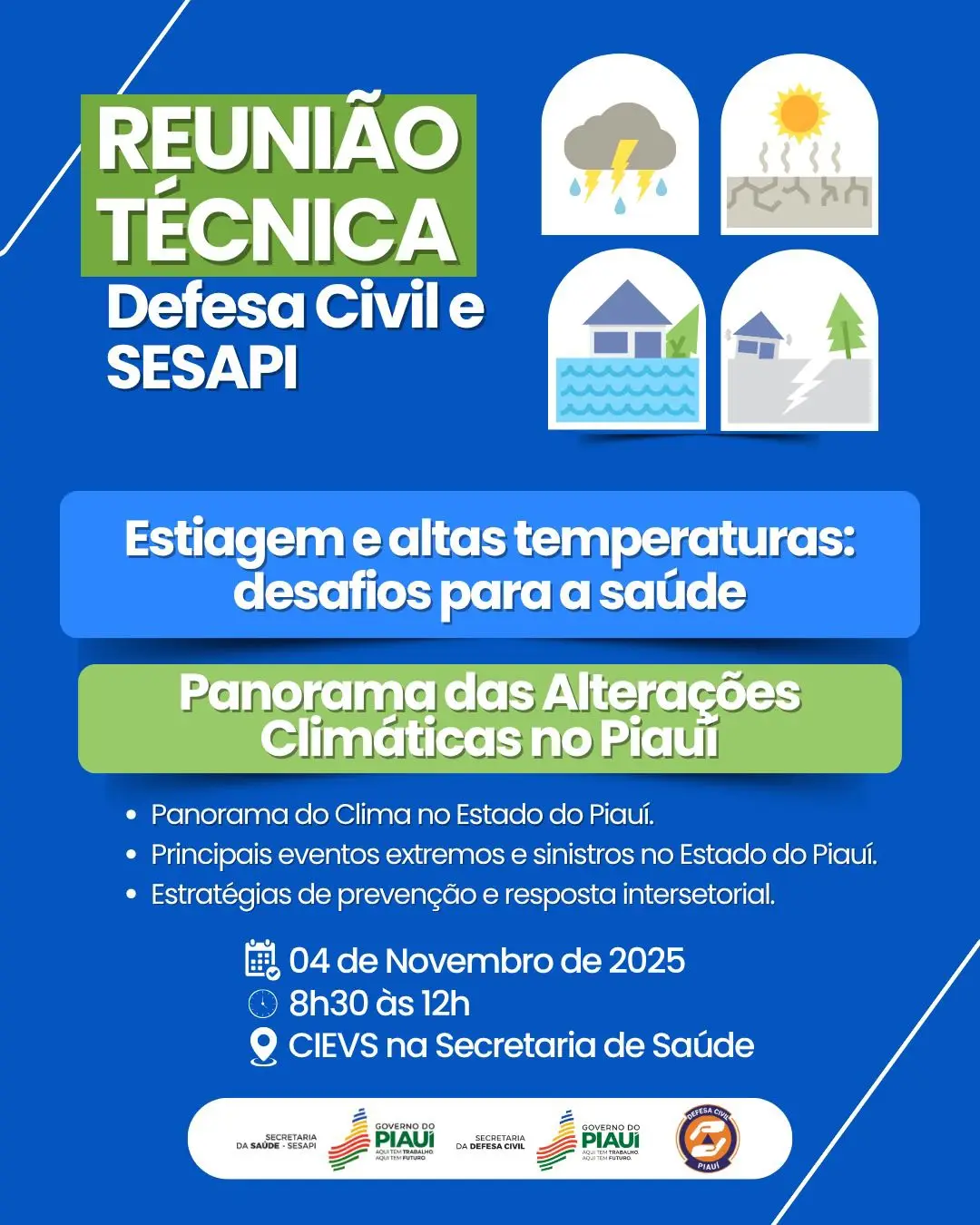 O tema é sobre estiagem e altas temperaturas no PiauíA Defesa Civil do Piauí e a Secretaria de Estado da Saúde (Sesapi) realizam nesta terça-feira, 4 de novembro, a primeira reunião técnica ampliada para discutir o cenário de estiagem e altas temperaturas e seus desafios para a saúde pública.