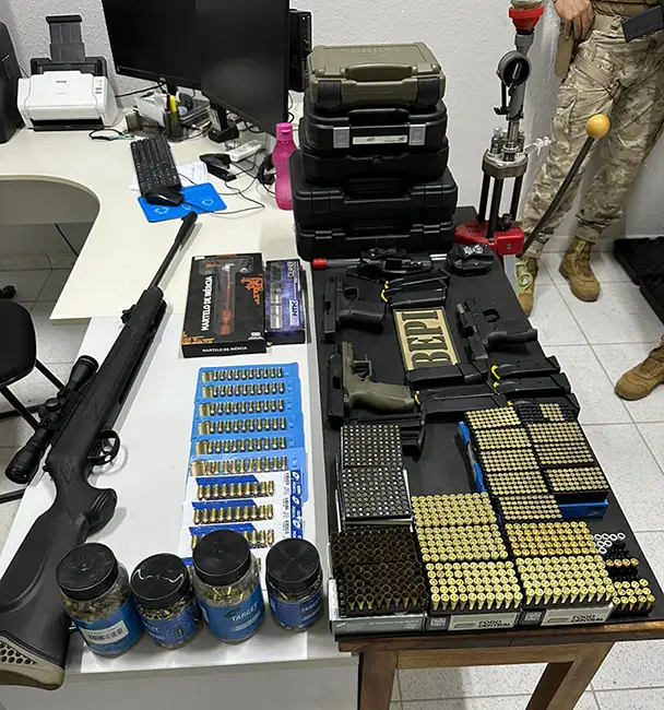 Nesta quarta (27), o parente da vítima acionou a Polícia Militar, que realizou a apreensão. No total, foram encontrados três pistolas, sendo uma Glock calibre .380, uma Taurus calibre .22 e uma Taurus G2C calibre 9mm, além de carregadores, coldres, alongadores, uma carabina de pressão, kits de limpeza, maletas e diversos acessórios de armamento. Também foram apreendidas 1.519 munições calibre .22, 155 munições calibre .380, 215 munições calibre 9mm, 900 espoletas e uma máquina de recarga de munições, entre outros materiais.