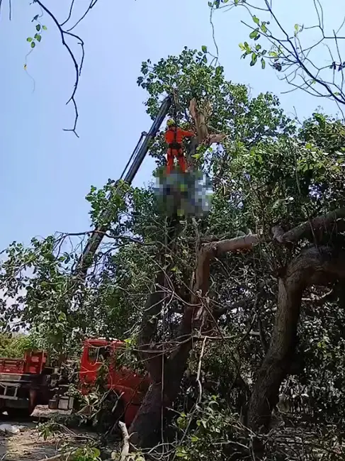 De acordo com o Corpo de Bombeiros, a vítima ficou presa no topo da árvore após o tronco cair sobre ela.
