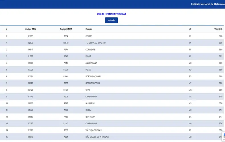 Conforme dados coletados das estações meteorológicas convencionais e automáticas do Inmet, Oeiras obteve a maior temperatura máxima observada/registrada no dia, com os termômetros marcando 39,8°C. Teresina (39°C), Corrente (38,9°C) e Picos (38,2°) aparecem na sequência do ranking nacional. Confira: