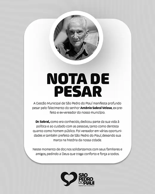 A Prefeitura de São Pedro do Piauí divulgou nota de pesar pelo falecimento do ex-gestor, destacando sua trajetória pública e manifestando solidariedade aos familiares e amigos.