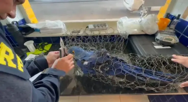 Na vistoria do porta-malas, os policiais encontraram a arara-azul em condições degradantes. Segundo o policial rodoviário federal Leandro Caldas, não havia qualquer dúvida sobre a crueldade envolvida. A ave apresentava sinais evidentes de maus-tratos, incluindo o bico serrado, e não possuía autorização ambiental para transporte.