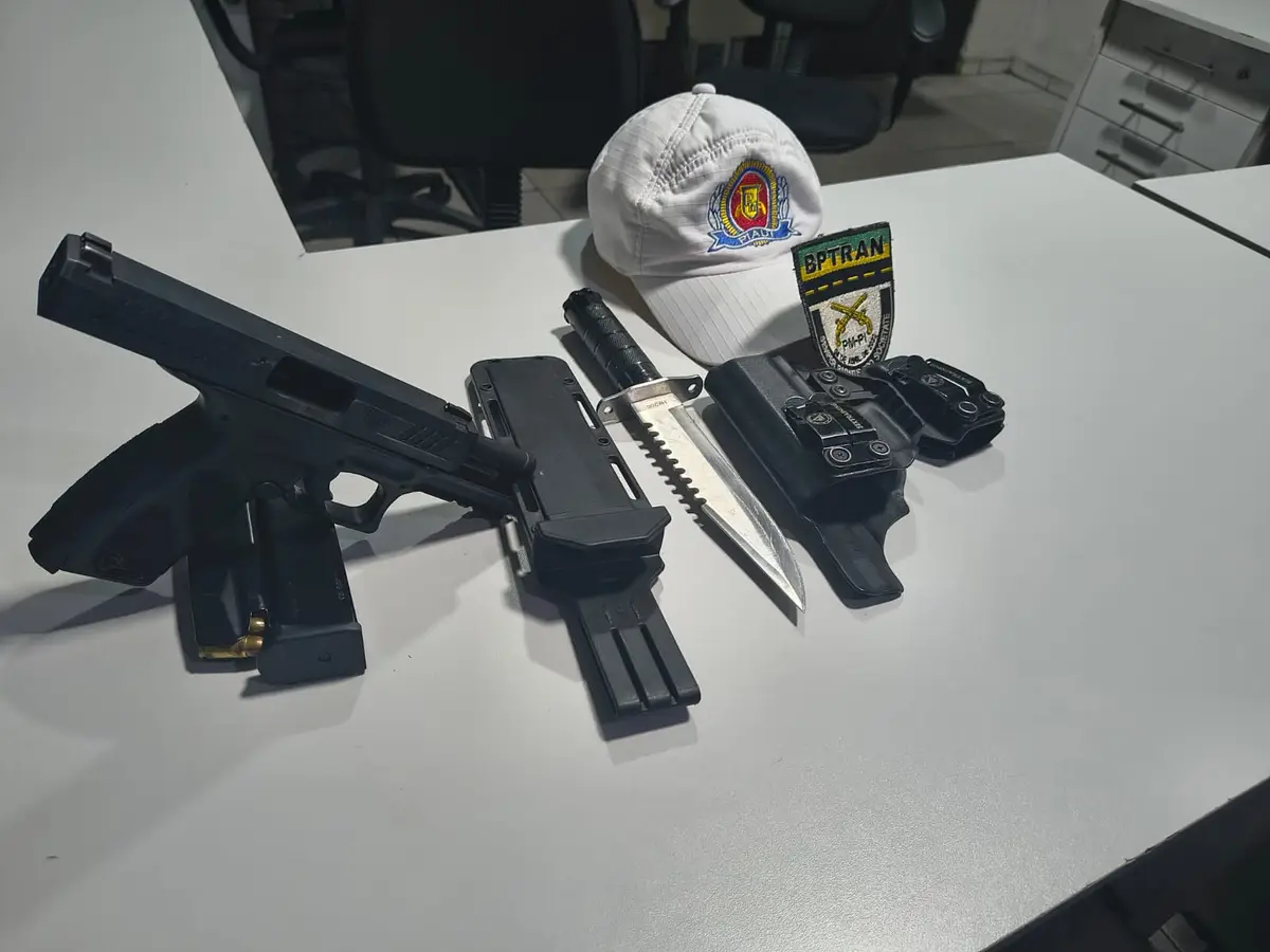 Durante a abordagem, os militares encontraram uma pistola 9mm na cintura do suspeito, dois carregadores com 17 munições cada — totalizando 34 munições intactas — e uma faca guardada dentro da mochila.